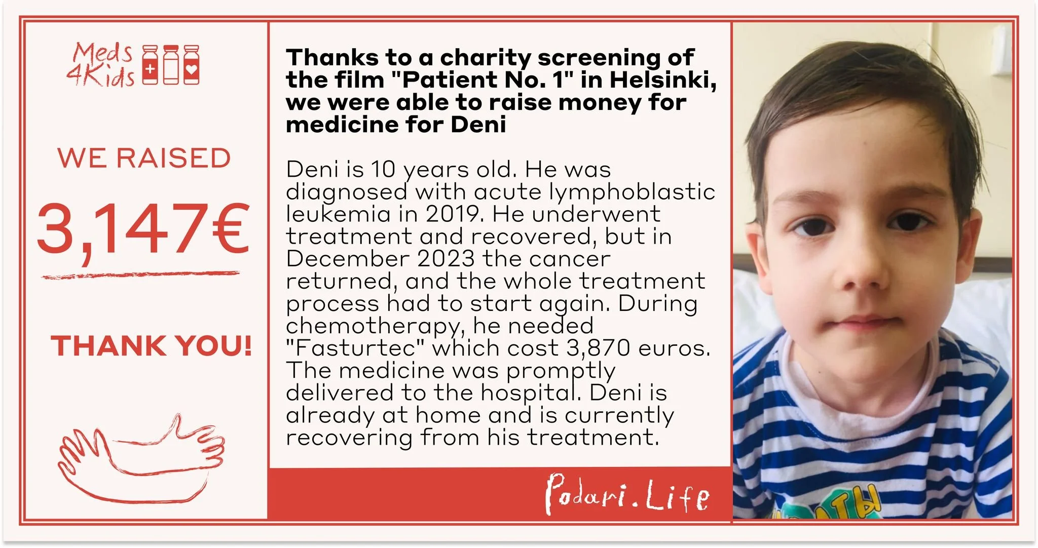 In August, our friends in Helsinki, Finland, hosted a charity screening of the film "Patient No. 1", with all proceeds going towards the treatment of children battling serious illnesses. We’re deeply grateful to the filmmakers and producers for this wonderful gift, allowing us to use their work to further our mission. Special thanks to our passionate volunteers who organized this event in support of Meds4Kids and to everyone who joined us for the screening. Because of you, we raised 3,147 euros, which will go directly to helping 10-year-old Deni get the care he needs.